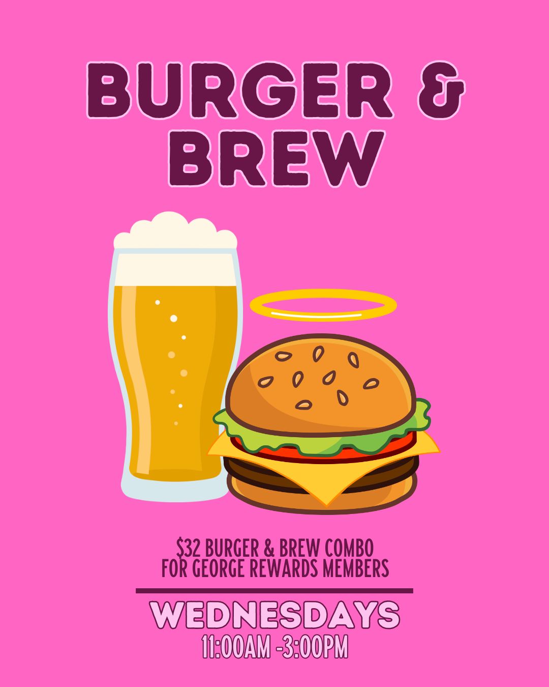 Come by on Wednesdays from open 'til 3pm for a burger paired with any beer or cider for only $32 for George Rewards Members